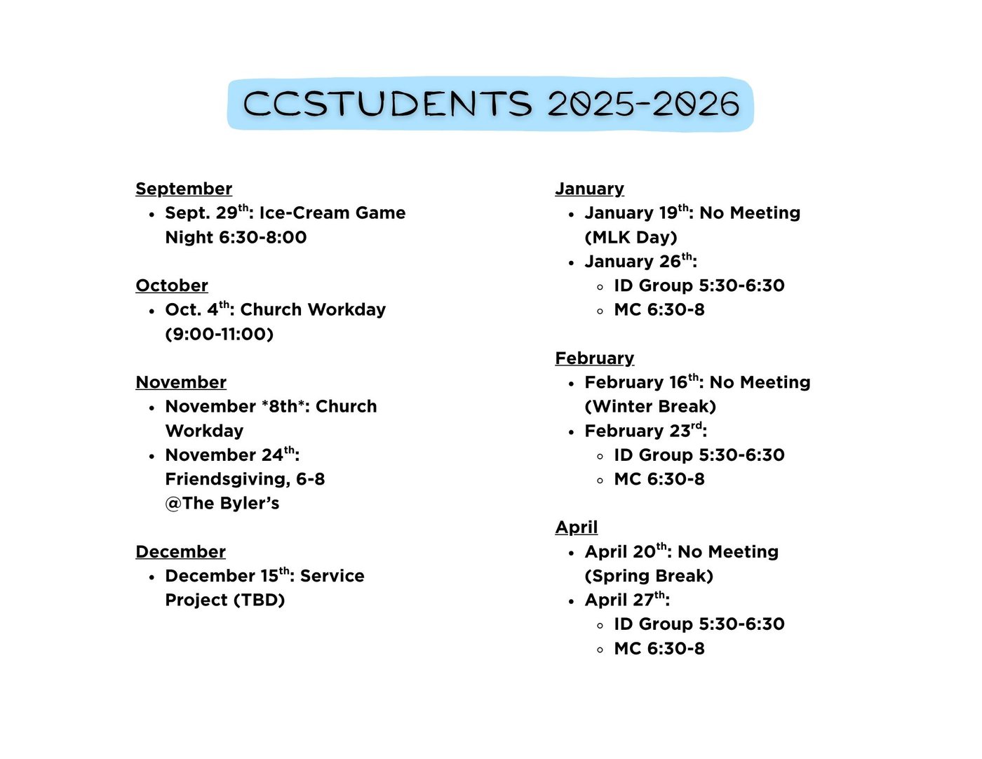 Our CCstudents community is led by a dedicated team of parents and volunteers. If you're interested in learning more or getting involved, please contact our church office.